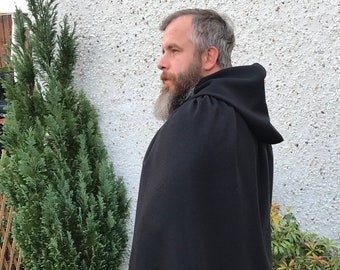 Hooded medieval wool cloak - - 100% Pure New Wool - solid black - Irish tweed - HANDMADE IN IRELAND