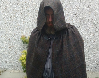 Hooded medieval 100% wool Irish Donegal tweed cloak - moss green/brown herringbone / orange/blue check - HANDMADE IN IRELAND