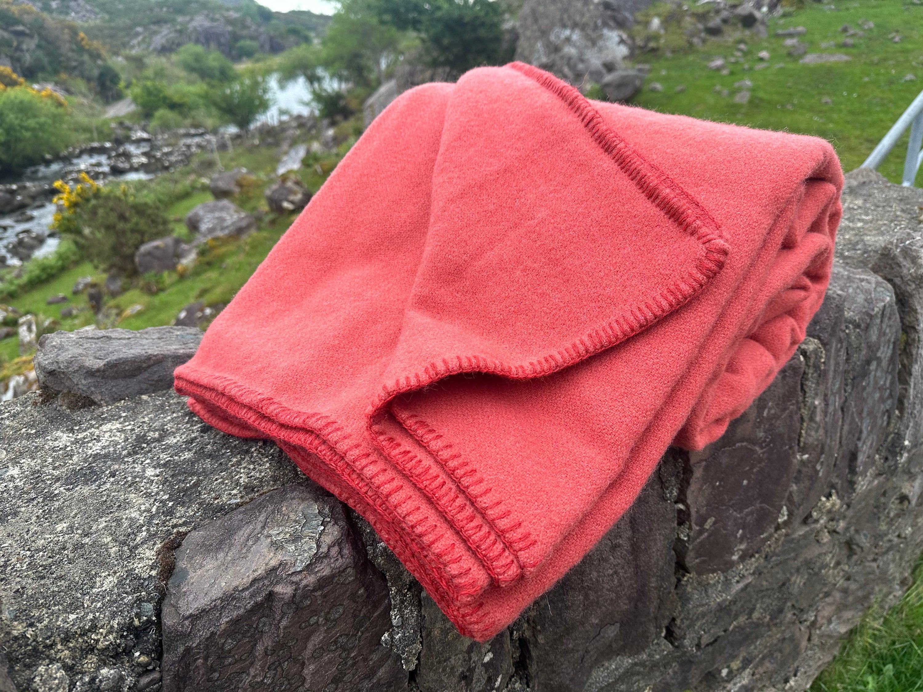 Immerse yourself in the timeless beauty and exceptional comfort of our heavy 100% Pure New Irish Wool Blanket. Lovingly handcrafted in Ireland, this solid coral blanket showcases the lush green landscapes of the Emerald Isle, with photos taken in the picturesque Gap of Dunloe, part of the renowned Ring of Kerry in Killarney.