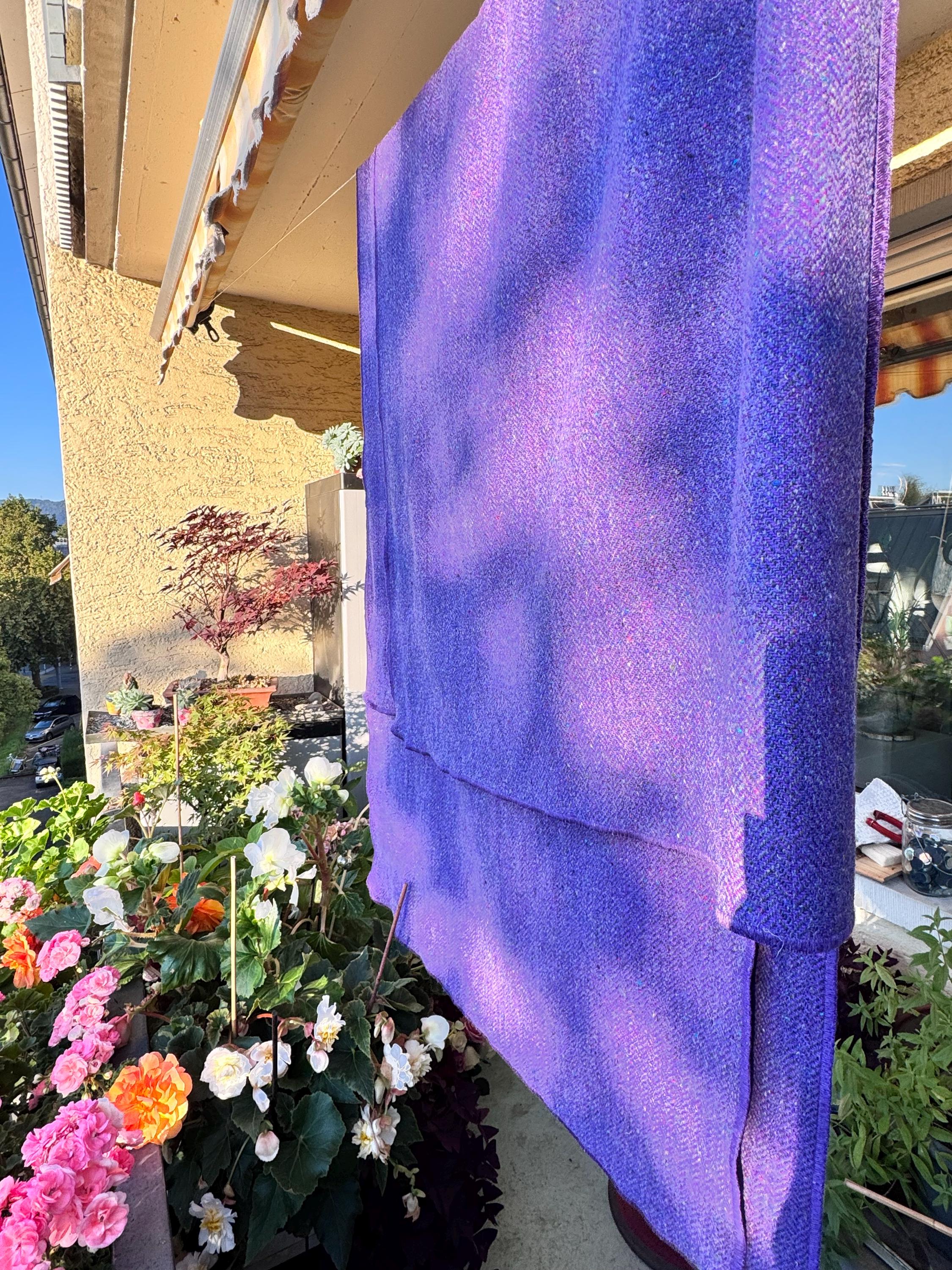 A striking purple herringbone design, woven in a rich combination of hues, offering both timeless style and durability. The heavy tweed fabric provides warmth, perfect for colder months, and adds an elegant, sophisticated touch to any outfit.
