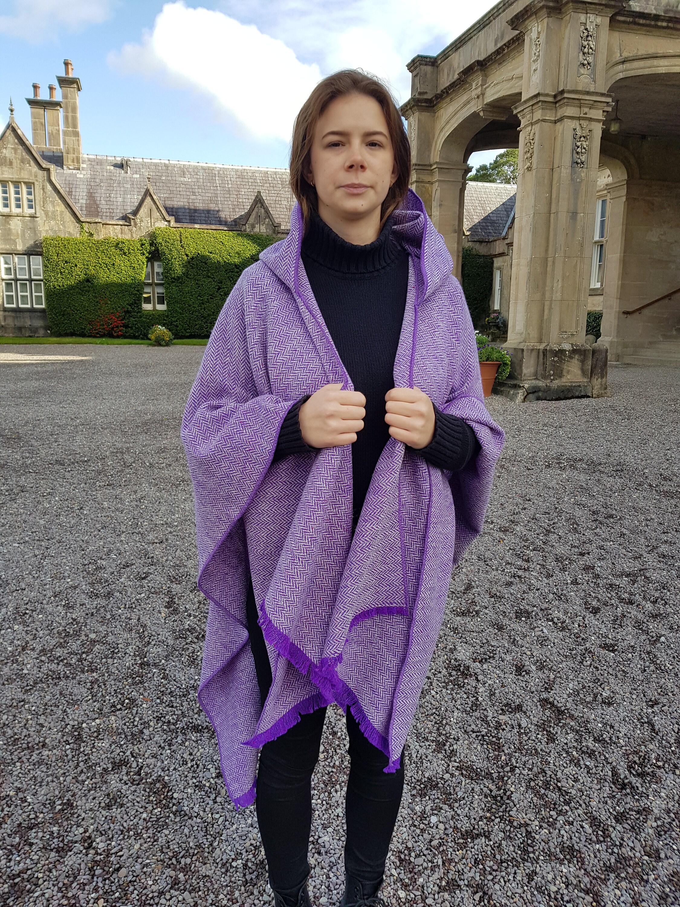 Irish Donegal Tweed Wool Hooded Cape, Cloak , Robe, Ruana, Wrap, Arisaid - Speckled / Fleck Purple & White Herringbone - HANDMADE IN IRELAND